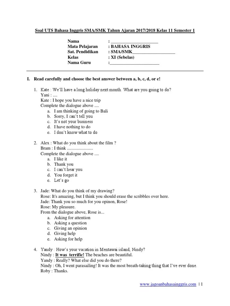 Soal ini bisa digunakan sebagai bahan latihan dalam menghadapi ujian akhir semester 1 mata pelajaran bahasa inggris untuk kelas 10 sma/ma.
